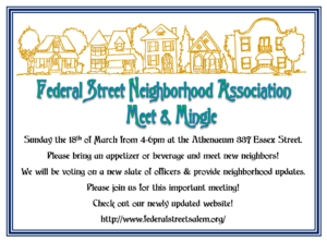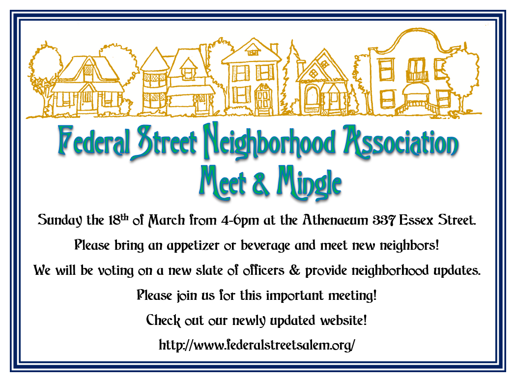 Please join us on March 18, 2018 at the Athenaeum Essex Street. If you can please bring an appetizer or beverage to share.