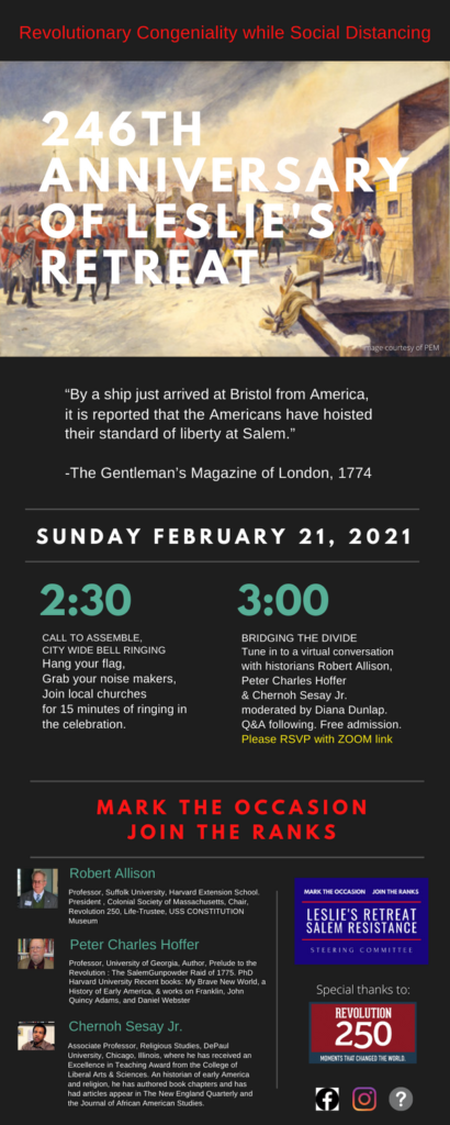 The Leslie’s Retreat Salem Resistance Steering Committee is pleased to announce that on the afternoon of Sunday, February 21, 2021, we will be presenting “Revolutionary Congeniality while Socially Distancing” event programming with both an interactive and a virtual component to celebrate the 246th Anniversary of Leslie’s Retreat. The afternoon will kick-off at 2:30 pm with “A Citywide Bell Ringing’. At 3:00 pm everyone is cordially invited to join scholar historians, Robert Allison, Peter Charles Hoffer, and Chernoh Sesay Jr. for “Bridging the Divide: Conflict, Violence and Negotiation in 1775 & Today”, a Zoom discussion moderated by Salem’s own public history actor and theater maker, Diana Dunlap, and presented in cooperative concert by The Leslie’s Retreat Salem Resistance Steering Committee and Revolution 250.