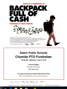There will be a screening of “Backpack Full of Cash,” a documentary which seeks to explore “the real cost of privatizing America’s public schools,” narrated by Matt Damon, at Cinema Salem on June 9 at 10 a.m. The suggested donation is $10. All proceeds from this event will benefit Salem Public School PTOs.